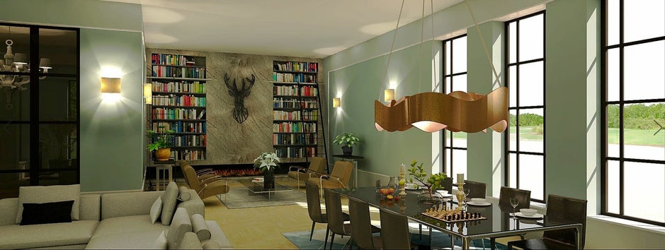 Deze grote woonkamer, met een plafondhoogte van 4 m en voorzien van hoge ramen en tuindeuren, is op verschillende manieren in te delen. Je plaatst er niet zomaar meubelen in, het moet passen in de ruimte, niet te groot, niet te klein, niet te zwaar enz. In dit voorstel is gekozen voor een aparte leeshoek bij een grote gashaard welke ingebouwd is in een grote boekenkast. Vanwege de hoogte is de boekenkast zowel links als rechts van de haard voorzien van een verrijdbare trap. Dit is een intieme hoek om rustig te relaxen of een fijn gesprek te voeren met anderen.