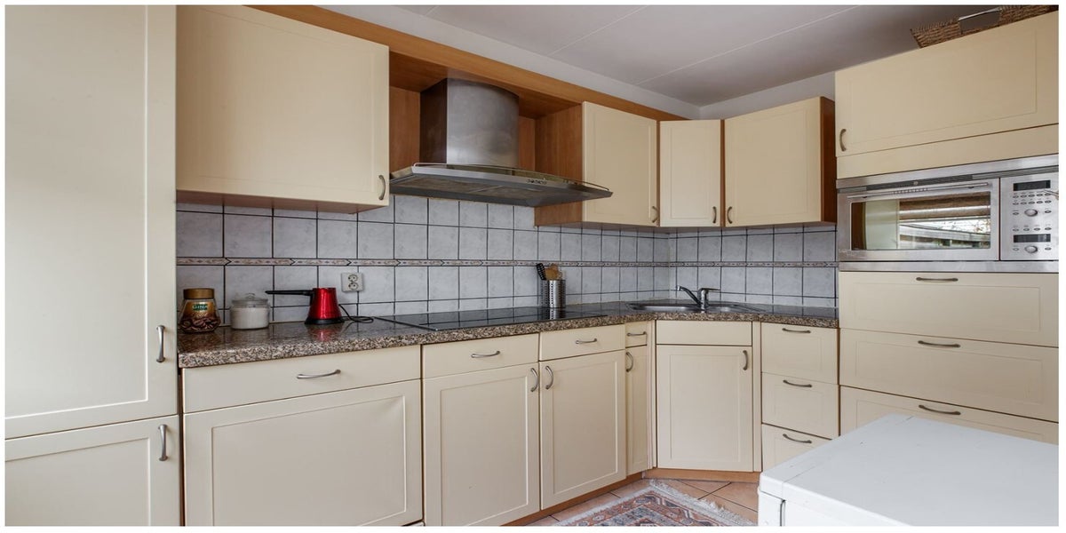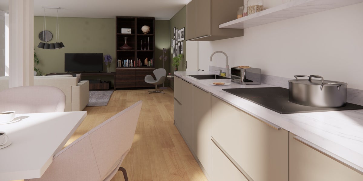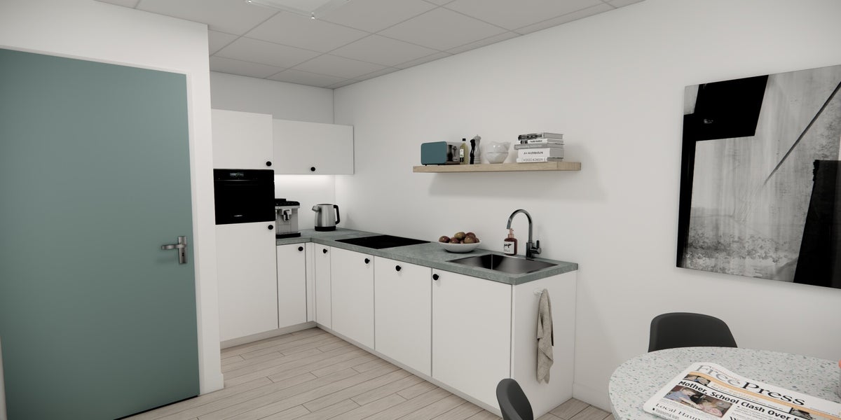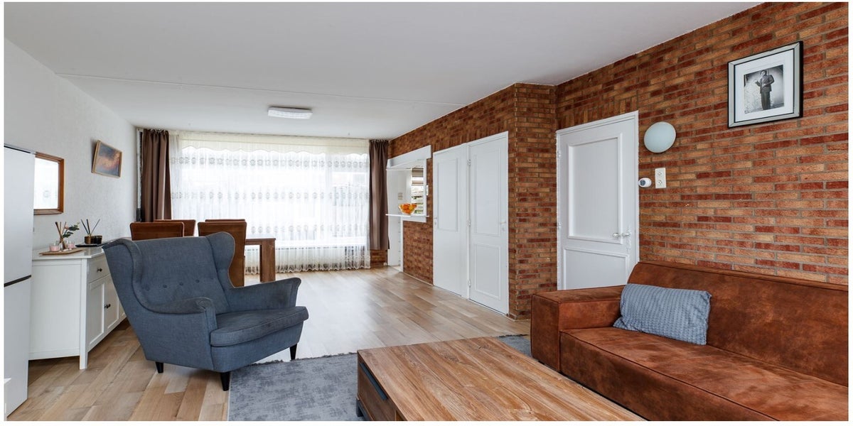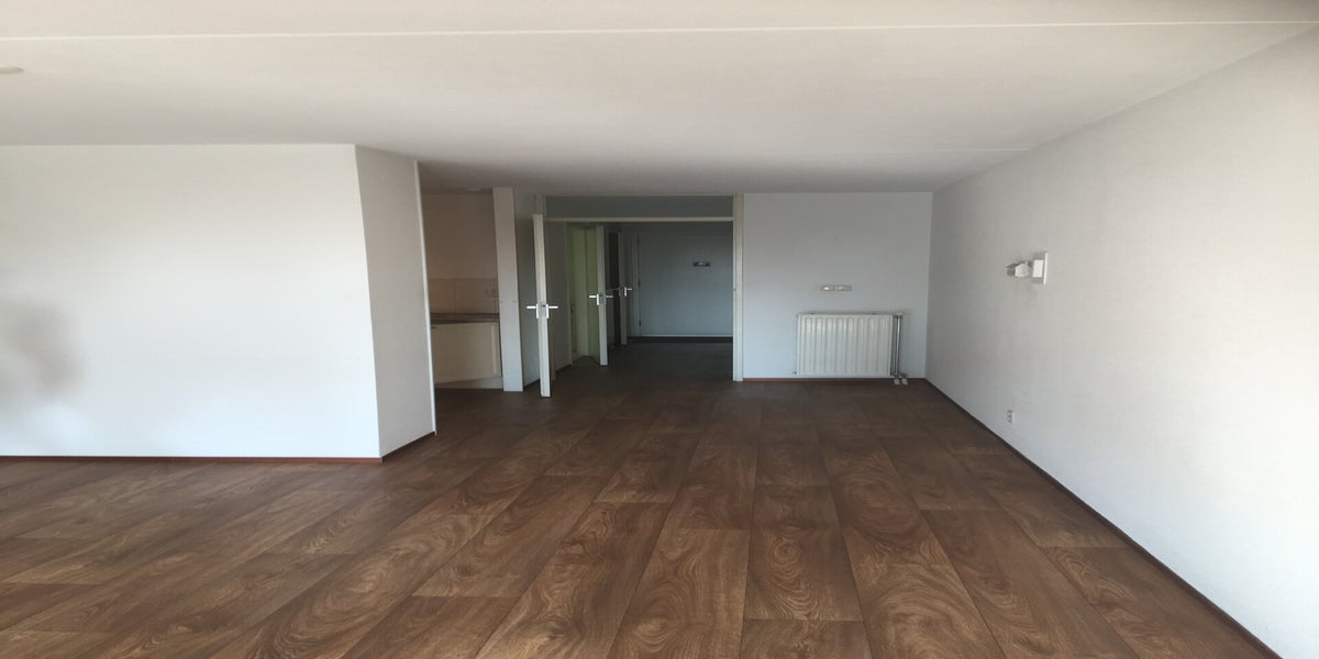 In dit appartement is één van de slaapkamers bij de woonkamer betrokken, waardoor een ruime L‑vormige leefruimte is ontstaan. De gesloten keuken is opengebroken en vervangen door een nieuwe, open keuken die direct aansluit op de woonkamer. Hierdoor voelt de woning lichter, ruimtelijker en meer verbonden.