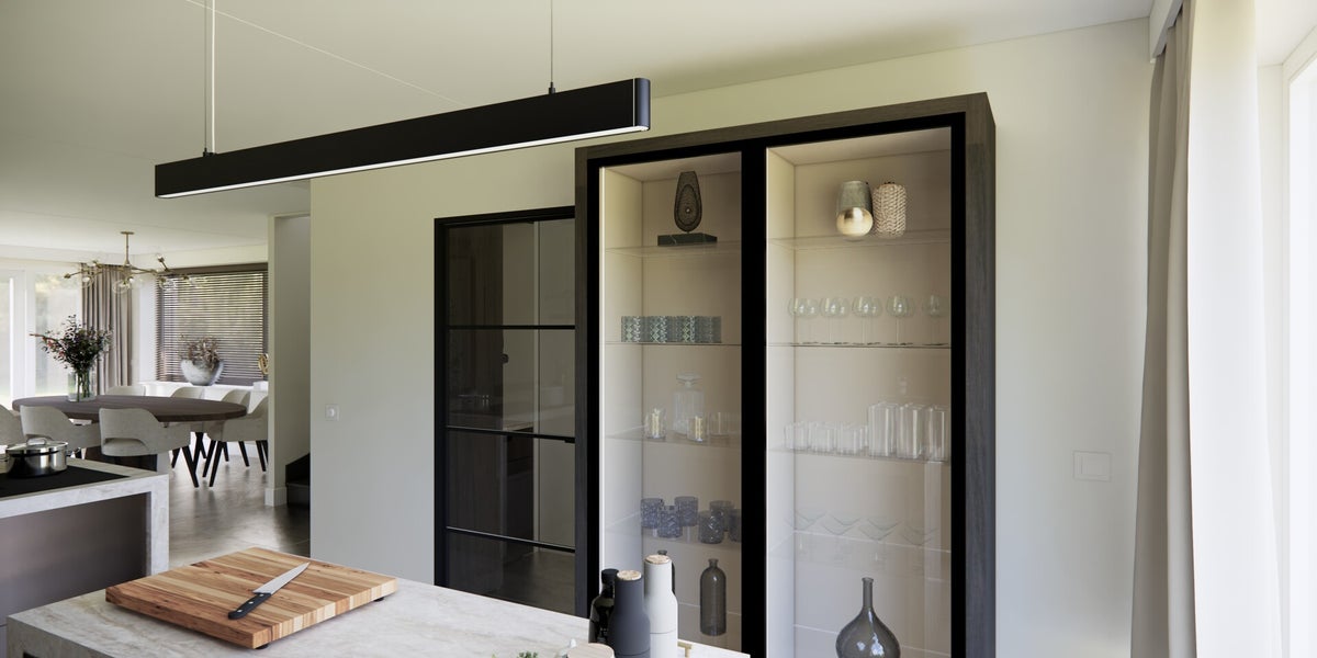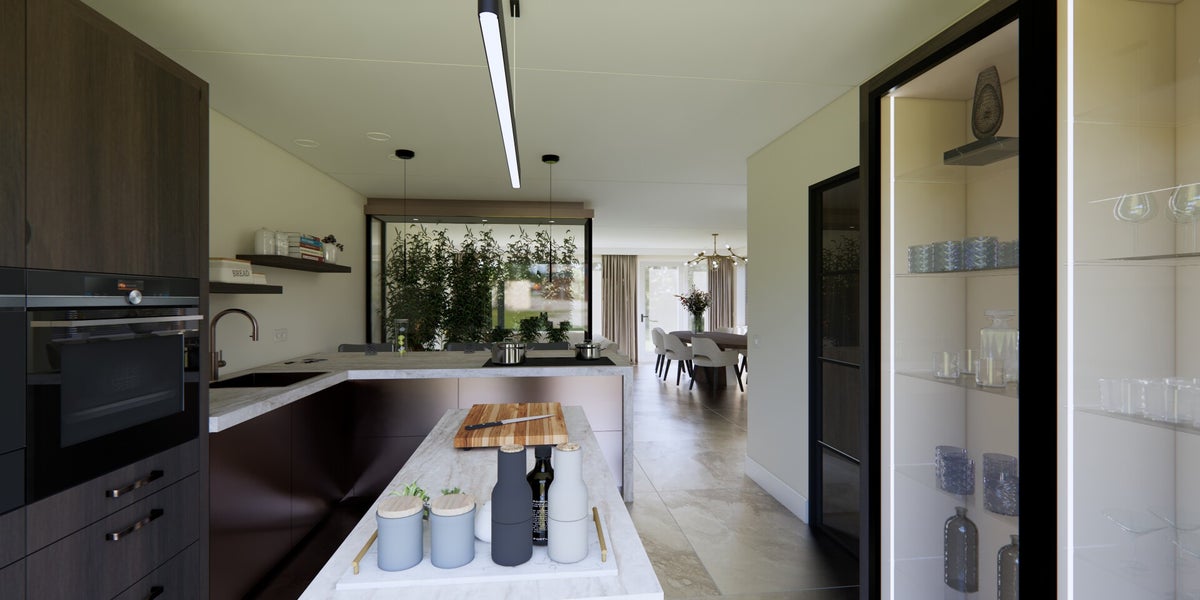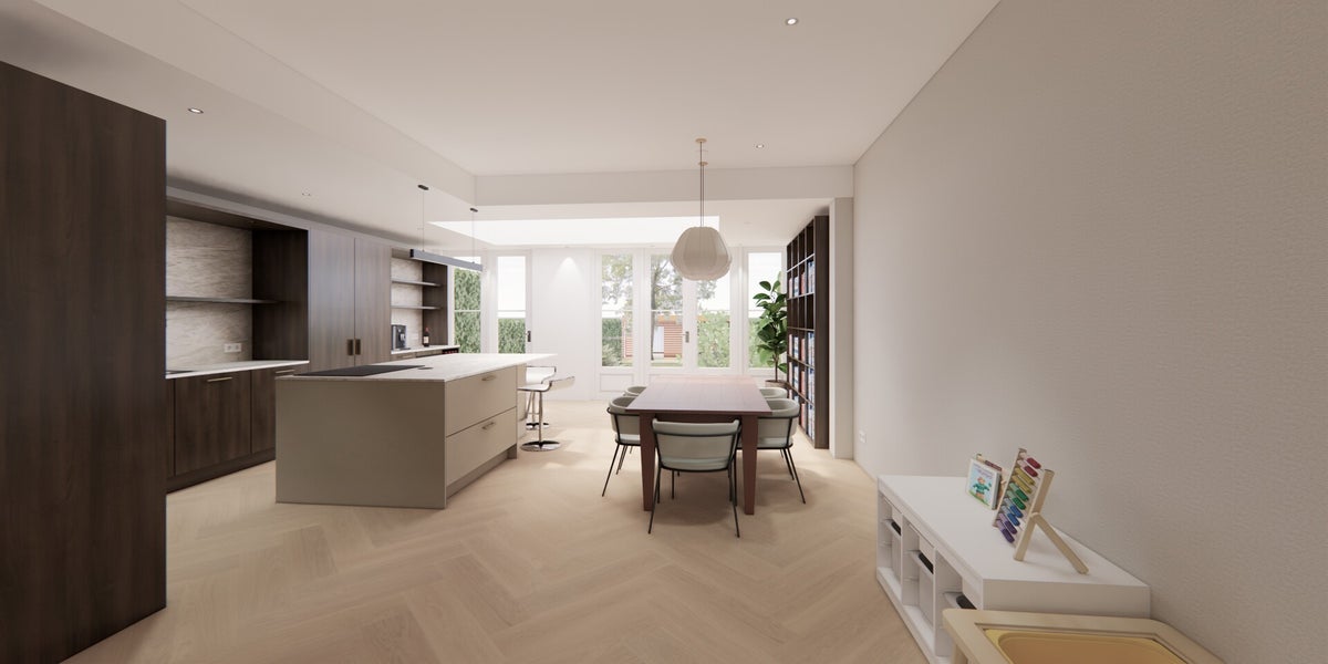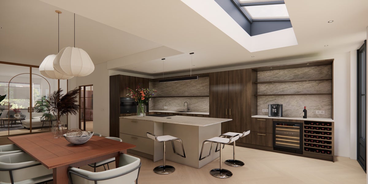 Deze woning in Wassenaar is aan de achterzijde over de volle breedte uitgebouwd, waardoor een royale en lichte leefruimte is ontstaan. De gesloten keuken is opengebroken en vervangen door een nieuwe, open keuken die mooi aansluit op de woonkamer. In het ontwerp is rekening gehouden met de lichtstraat en de verlaagde plafonds door de bestaande balkenconstructie, zodat alles één rustig geheel vormt.