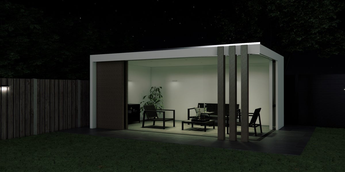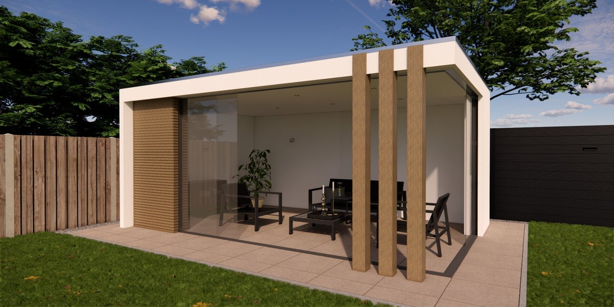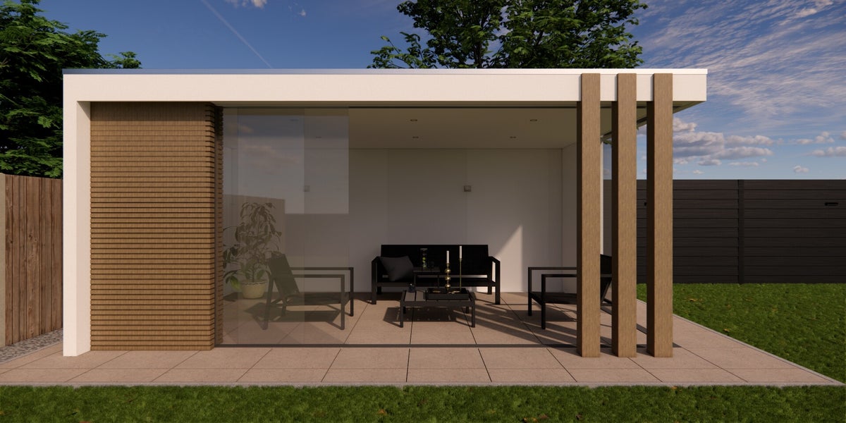 Een tuinkamer is altijd maatwerk. In dit ontwerp staat ontspannen buitenleven centraal: in de zomer kunnen de schuifruiten volledig worden weggeschoven in een dubbele wand, waardoor een open en vrij gevoel ontstaat. Wanneer het frisser is, biedt het glas beschutting en kun je comfortabel uit de wind zitten.